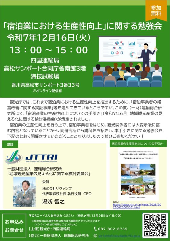 観光庁・四国運輸局主催「『宿泊業における生産性向上』に関する勉強会」が令和7年12月16日(火)、四国運輸局(高松サンポート合同庁舎南館3階)にて開催されます。