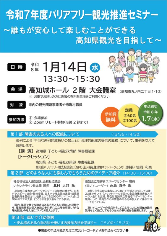 高知県バリアフリー観光相談窓口では、高齢者や様々な障害のある方および高知県を訪れている観光のお客様、全ての人が安心して楽しく高知観光をしていただけるよう、県内の観光関連事業者や市町村職員を対象に「バリアフリー観光推進セミナー」を開催します。