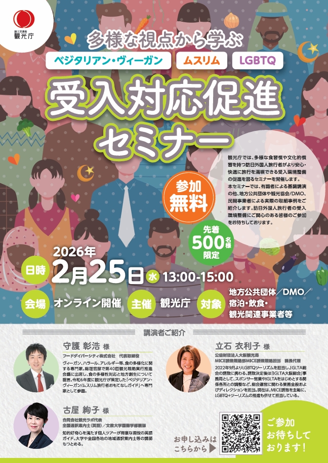 観光庁では、多様な食習慣や文化的慣習を持つ訪日外国人旅行者がより安心・快適に旅行を満喫できる受入環境整備の促進を図るセミナーを開催します。