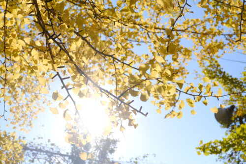 色づき始め、紅葉の真っ盛りも美しいですが、イチョウの葉が段々と落ちていき、地面を黄色に染める景色もまた美しいです。