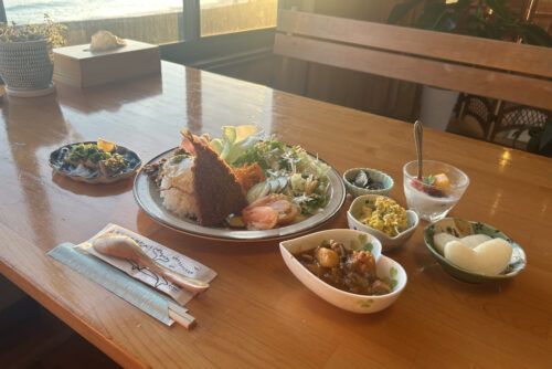 お食事は、日替わりのエスニック料理と、地元で獲れた旬のお魚を組み合わせた献立をご用意しています。