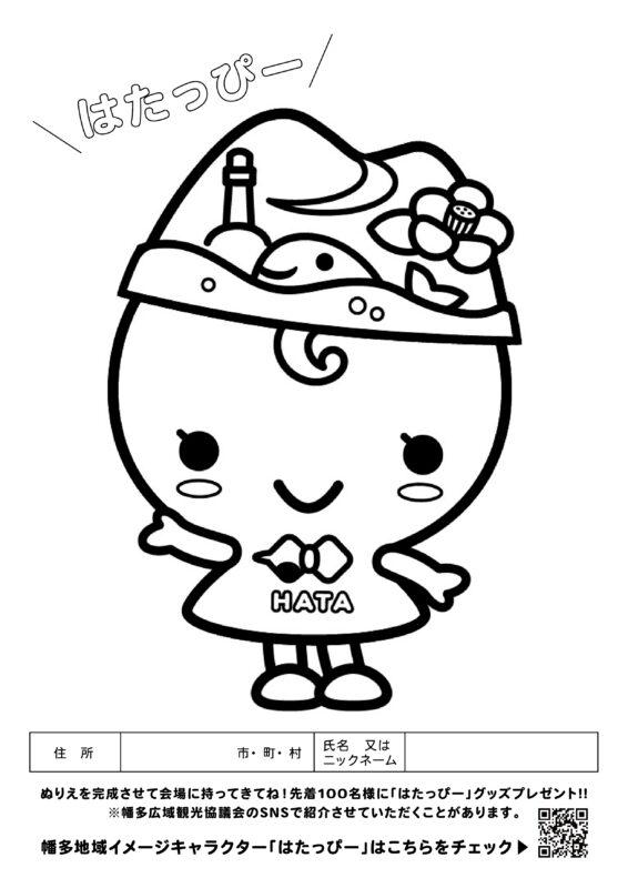 *チラシのぬりえを完成させて会場に持っていくと、先着100名様に「はたっぴー」グッズのプレゼントがあるそうです。