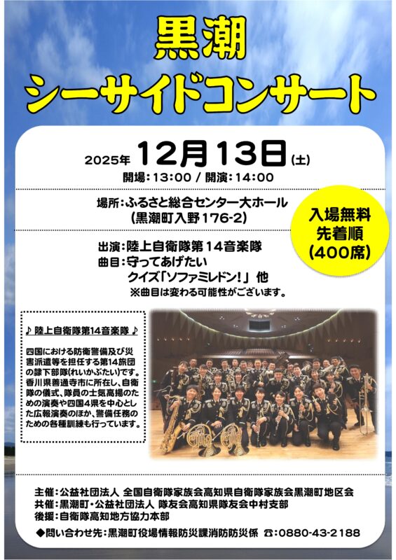 陸上自衛隊第14音楽隊による「黒潮シーサイドコンサート」が12月13日(土)、ふるさと総合センターで開催されます。入場無料でお聴きいただけますので、ぜひお誘いあわせのうえご来場ください。